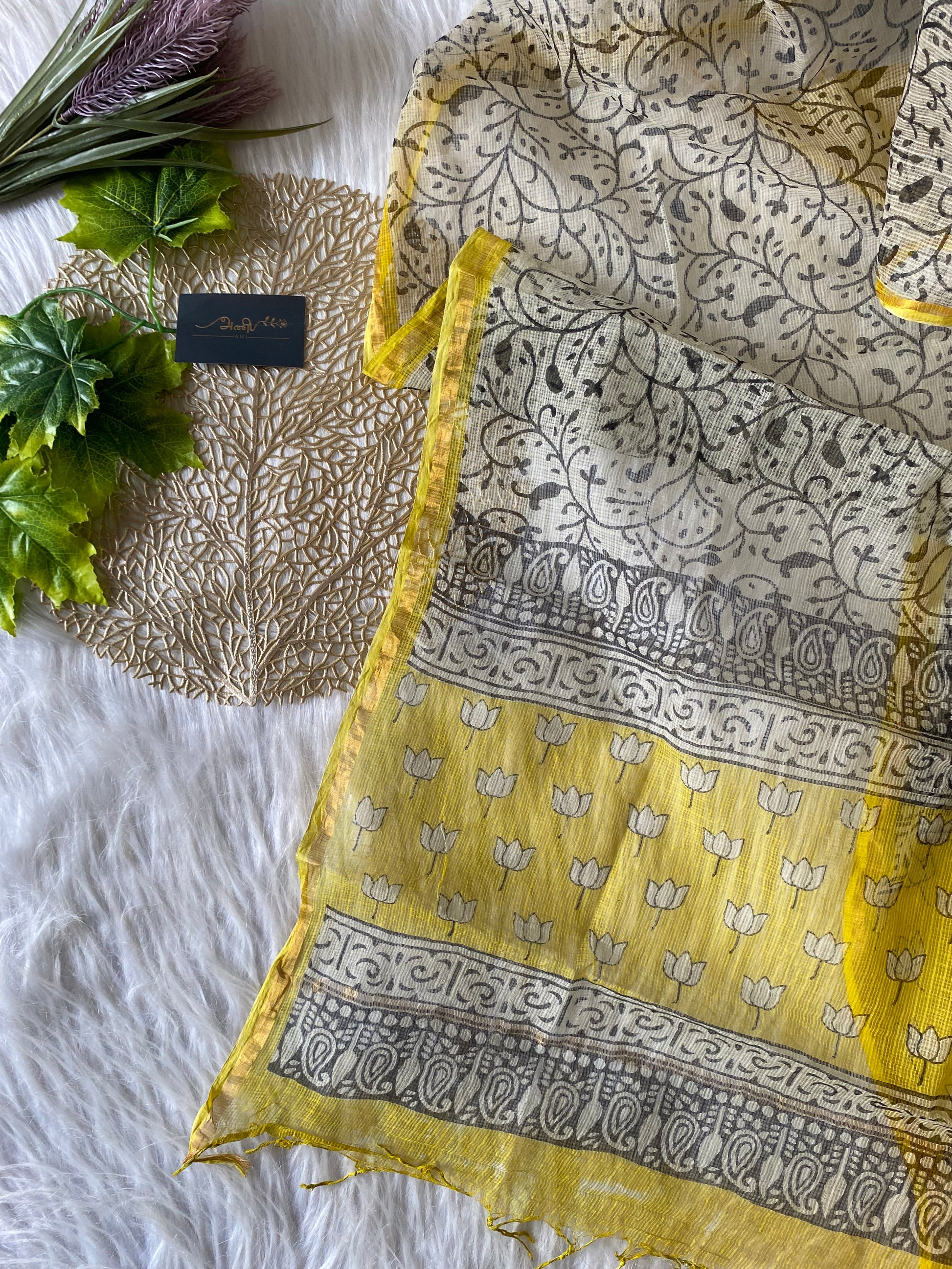 AKD115 - Kota doria - Yellow with white Lotus motif