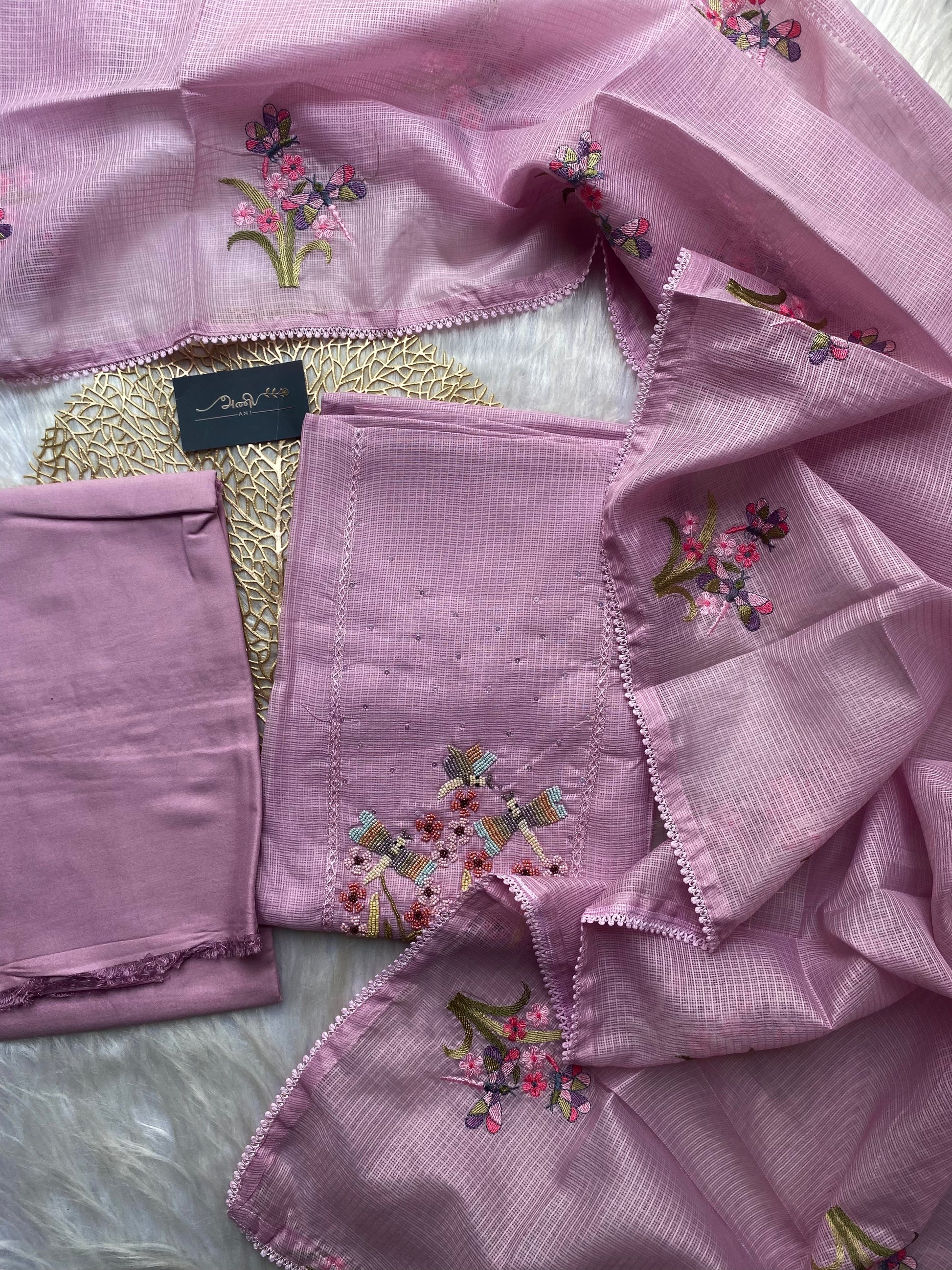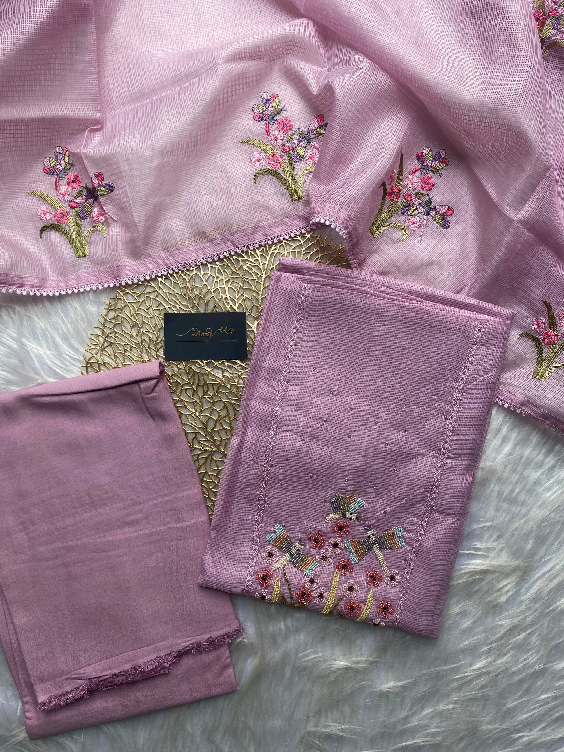 AKD102 - Mauve kota doria salwar material with garden themed embroidery